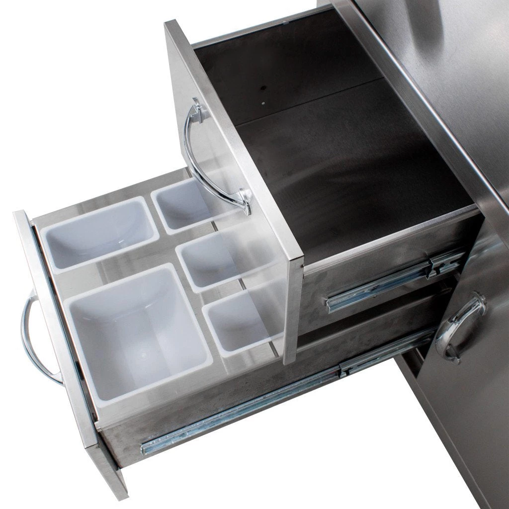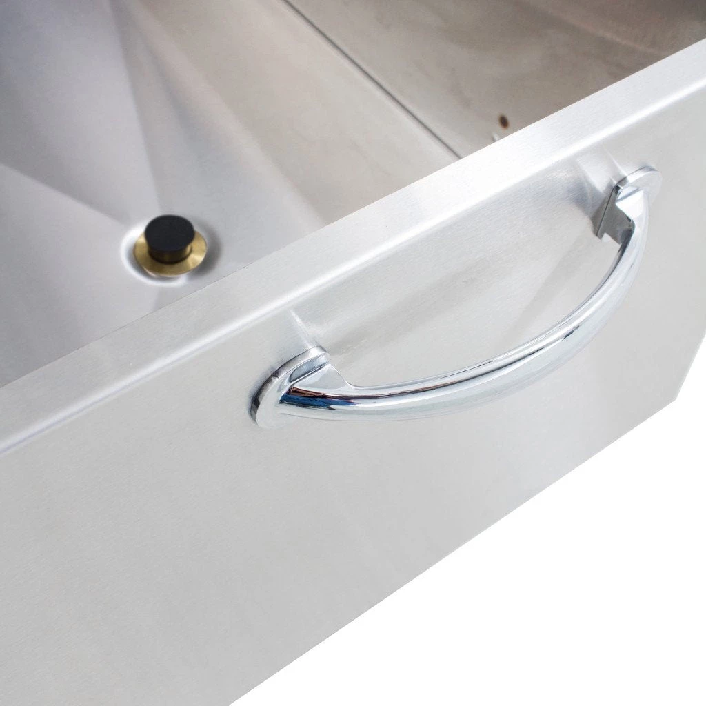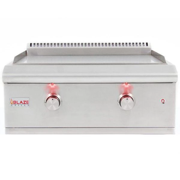 The freestanding griddle from Blaze is designed to take outdoor entertaining to a new level. The amazing versatility of the Blaze griddle allows you to cook up bacon and eggs, juicy hamburgers or sizzling fajitas with rice and veggies for the whole family. This Blaze propane gas griddle is equipped with two commercial quality, 304 stainless steel U-shaped burners that each deliver 18,000 BTUs of cooking power for a total of 36,000 BTUs across the 495 square inch stainless steel cooking surface. Push and turn flame-thrower primary ignition, backup flash tube secondary ignition and cross tubes ensure a steady, reliable flame with every start. A large capacity grease trough with a hole in the center directs grease down to the drip tray below for easy cleaning. This freestanding griddle is constructed entirely from heavy-duty. 304 grade stainless steel for outstanding durability. The deluxe cart features a two drawers for storing grilling accessories and one large door for a standard 20 pound propane tank. While you are using the griddle, you can store the griddle lid behind the cart on the storage bracket. The bottom drawer includes a tray with seven individual, removable containers for keeping veggies or condiments conveniently nearby. The insulated drawer can be filled with ice to keep food chilled. It is also equipped with a drain for easy ice removal. The cart moves around easily on heavy-duty casters so you can move it around on the patio while entertaining. The Blaze freestanding griddle also carries an ETL certification. Lifetime warranty to the original owner against defects in manufacturing and workmanship. This warranty extends to the original purchaser against manufacture defects for products purchased for ordinary single-family home use.
