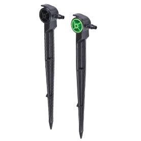 DIG’s PC Drip Emitter Stakes with barbed inlets are turbulent-flow-path pressure compensating drip emitters, designed to produce a consistent flow rate of either 1 GPH (model 06-054) or 2 GPH (model 06-055) under a pressure range of 10 to 40 PSI. The emitter stakes contain a diaphragm that continuously adjusts to varying water pressures regardless of elevation or any pressure fluctuation along the laterals, ensuring even and consistent flow rates from each drip emitter. They can be used for any type of planting, including pots and baskets, and with long runs of drip tubing. Use 1/4” micro tubing to extend the emitter stakes from the drip tubing directly to the plant.