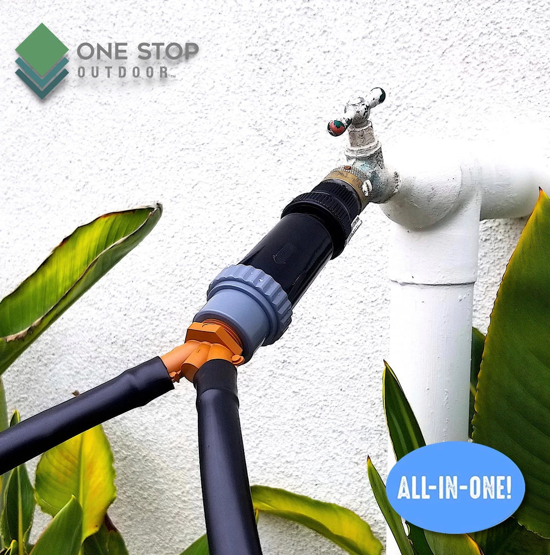 - Drip Irrigation Faucet Adapter Connector Kit: Connect Two Lines 1/2 Inch Tubing to Faucet or Garden Hose – Backflow Preventer. Filter, Pressure Regulator, Adapter Coupling (1/2 Inch Double Outlet)