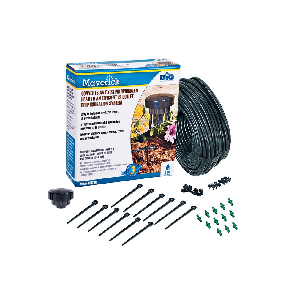 DIG’s Maverick™ Twelve-Outlet Drip Kits are used to retrofit an existing ½” sprinkler riser into a twelve outlet drip irrigation system without altering or increasing the flow of the sprinkler system zone. The twelve-outlet drip manifold utilizes extremely accurate pressure compensating individual and interchangeable nozzles to ensure equal flow from each outlet over a wide range of operating pressures from 10 to 80 PSI. The Kit allow installation flexibility when incorporated into a new system. Each kit manifold contains a twelve outlet drip irrigation manifold with 2 GPH pressure compensating drip emitters, twelve stakes, eight caps, twelve bug plugs and twelve color-coded converter barbs to convert the 1/8” outlet for use with ¼” micro tubing. Additionally the MAVERICK™ PC12100 kit contains 100’ 1/8” micro tubing.