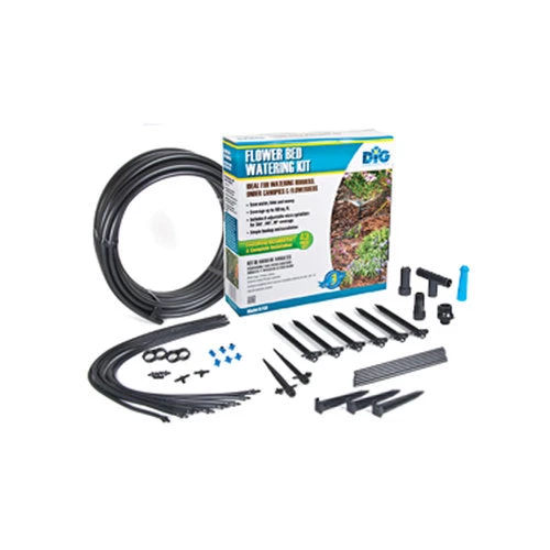 DIG’s Adjustable Micro Sprinkler Kit is a complete kit that includes all the parts needed to install a micro sprayer system to water shrubs, groundcovers, flowerbeds and under trees canopy. The kit can cover up to up to 160 SF and can be expanded to cover more than 320 SF using additional drip tubing, micro sprayers and stakes. This adjustable micro-sprayer kit contains all the parts needed to start a system from a faucet or a garden hose that later can be automated. The kit includes a ¾” backflow preventer, ¾” 25 PSI pressure regulator, ¾” swivel adapter, 50’ of our premium ½” drip tubing with .600 ID x .700 OD, six adjustable stakes, eight micro tubing assemblies and six micro sprayers with 360°, 180°, 90° pattern; also included in this kit are two, 360° adjustable umbrella pattern micro sprayers with 5″ stake and 1/4″ barb, and all other parts needed in order to complete the installation.